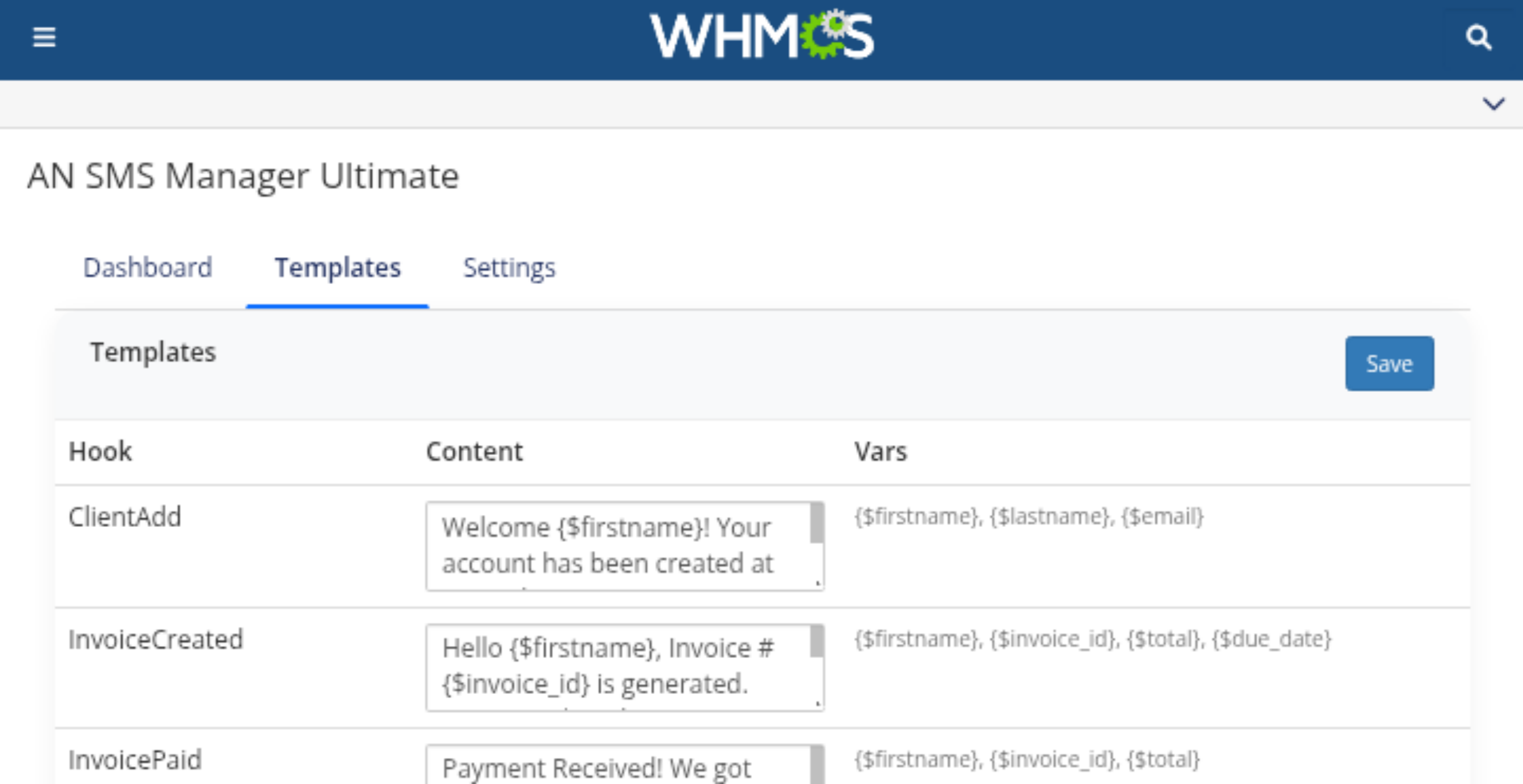 Full control over your message content. Use dynamic variables (like {$firstname}, {$invoice_id}, {$total}) to send personalized messages for every single hook.